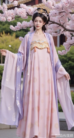 (masterpiece, best quality:1.23),A beautiful girl in a chest - high shanqun of Tang style. She wears a light - pink big sleeve shirt that is light and elegant, embroidered with delicate flower - and - bird embroidery with fine stitches. Paired with a high - waist skirt of the same color system, the skirt is embroidered with peony flower patterns in gold thread, rich and magnificent. She drapes a light - purple pibo shawl over her shoulders, swaying gently in the wind. The girl has a perfect figure and long legs. Standing in an antique Chinese - style courtyard, beside a blooming peach - blossom tree with petals falling, photographed in a Chinese - style and ancient - rhyme photography style. The picture has a soft color tone, and the background is appropriately blurred to highlight the girl's classical beauty,(huge breasts, full breasts:2.98)