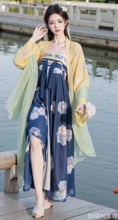 (masterpiece, best quality:1.23),A beautiful girl with a perfect figure and long legs wearing a qixiong ruqun of Tang - style. The goose - yellow qixiong ru is embroidered with light - blue scroll - grass patterns with smooth lines. The navy - blue high - waist Pleated skirt is embroidered with white plum blossoms, fresh and elegant. She drapes a light - green pibo shawl over her shoulders, with silver - thread patterns embroidered on the edge. The girl stands on the zig - zag bridge in a Chinese - style garden. The lake water below the bridge is clear, and koi fish are swimming. Presented with Chinese - style and ancient - rhyme photography techniques, the picture has a fresh color tone, and the background is blurred to highlight the girl's elegant temperament,(huge breasts, full breasts:2.98)