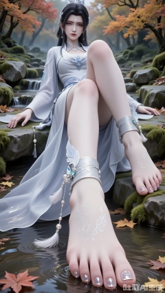 A beautiful woman sits on a stone, barefoot, with a close-up of her feet. Shot from a low angle. Overall: Create an aesthetic scene where the character blends with the natural environment, facing the viewer.