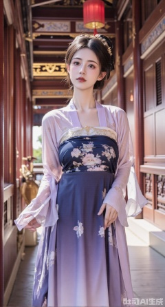 (masterpiece, best quality:1.23),A beautiful girl with a perfect figure and long legs in a qixiong ruqun of Tang system. She wears a lotus - root - colored straight - collar shirt embroidered with light - purple butterflies and flowers, vivid and lively. Paired with a navy - blue high - waist Pleated skirt, the skirt is embroidered with silver cranes, meaning longevity. She drapes a light - purple pibo shawl over her shoulders. The girl stands under the corridor of a Chinese - style courtyard. The corridor has carved railings and painted beams, with red lanterns hanging high. Photographed in a Chinese - style and ancient - rhyme style, the picture is full of traditional charm, and the background is blurred to highlight the girl,(huge breasts, full breasts:2.98)