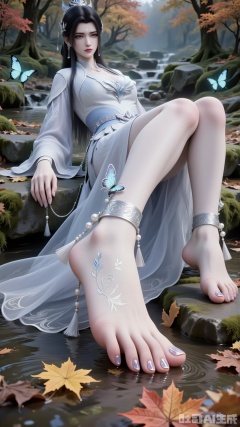 - Legs & Feet: Exposed slender legs. Barefoot with shiny transparent nail polish, manicured nails, visible toes, and a butterfly-pendant ankle bracelet.