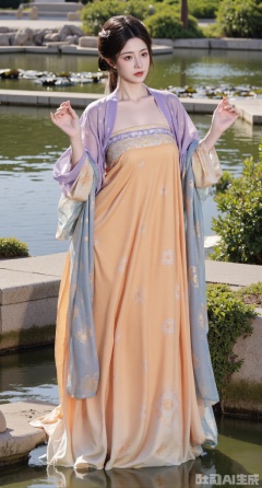 (masterpiece, best quality:1.23),A beautiful girl with a perfect figure and long legs wearing a chest - high shanqun of Tang - style. The light - purple qixiong shirt is embroidered with golden vine - grass patterns, delicate and luxurious. Paired with an orange - yellow high - waist Pleated skirt, the skirt hem is embroidered with light - blue lotuses, fresh and refined. She drapes a light - gray pibo shawl over her shoulders. The girl stands beside the rockery in a Chinese - style garden. The rockery is covered with green moss, and there is gurgling water around. Presented in a Chinese - style and ancient - rhyme photography style, the picture has a harmonious color tone, and the background is blurred to highlight the girl's temperament,(huge breasts, full breasts:2.98)
