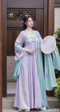 (masterpiece, best quality:1.23),A beautiful girl with a perfect figure and long legs wearing a qixiong shanqun of Tang dynasty hanfu. The light - blue qixiong shirt is as light as gauze, embroidered with butterfly patterns in colorful silk threads, vividly. ,(huge breasts, full breasts:2.58),Paired with a light - purple high - waist Pleated skirt, the skirt hem is embroidered with golden ruyi cloud patterns, meaning good luck. She drapes a light - cyan pibo shawl over her shoulders. The girl holds a round fan painted with orchids, standing in front of the moon - shaped door of a Chinese - style courtyard. There are potted bamboo plants placed beside the door. Presented in a Chinese - style and ancient - rhyme photography style, the picture is full of poetry, and the background is blurred to highlight the subject,(huge breasts, full breasts:2.98)