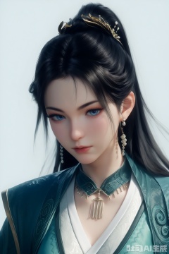 score_9,score_8_up,score_7_up,1girl,long hair,breast,medium breast,earrings,hair_ornament,ponytail,dress,black hair,blue eyes,chinese_clothes,cape,simple background,white_background,portrait,