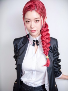 1girl,makima \(chainsaw man\),solo,necktie,braid,looking at viewer,red hair,shirt,black necktie,yellow eyes,braided ponytail,white shirt,formal,suit,breasts,collared shirt,long hair,sidelocks,arms behind back,ringed eyes,smile,lips,jacket,grey background,simple background,coat,upper body,black jacket,black coat,pants,closed mouth,black pants,