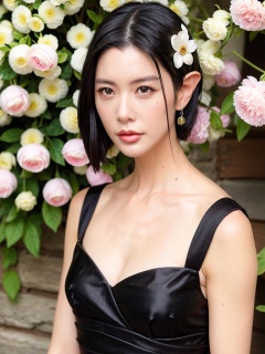 1girl, solo, black hair, short hair, jewelry, realistic, earrings, hair ornament, black eyes, lips, collarbone, parted lips, flower, watermark, upper body, portrait, hair flower, dress, web address, looking awayirt, elf,