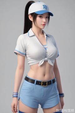 score_9_up,score_8_up,score_7_up,NRYR,1girl, solo, shorts, blue eyes, black hair, thighhighs, wristband, baseball cap, navel, long hair, midriff, short shorts, belt, shirt, hand on hip, lips, white shorts, white background, blue thighhighs, looking at viewer, tied shirt, simple background,ponytail