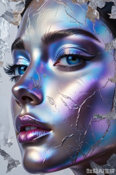 with intricate and colorful makeup that appears to be metallic and iridescent. The makeup covers the skin