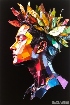 fragmented elements that make up the figure. The figure's head is depicted in a mosaic of vivid hues