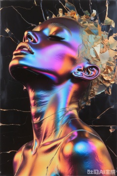 and lips slightly parted. The individual's skin is rendered in a metallic
