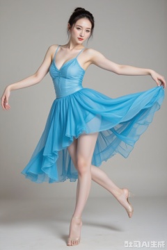 A tall model leaps into the air, her BLUE dance skirt floating and forming a fan. The large, layered tulle skirt is irregularly distributed in mid-air, covering her stretched legs. Against a solid color background, the dynamic movement contrasts sharply. Her hair is tied back, and she faces the camera, exuding elegance and grace.
