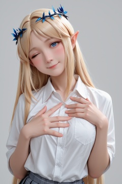 masterpiece,best quality,good quality,1girl,cartethyia \(wuthering waves\),school uniform,white white shirt,plaid skirt,blonde hair,blue eyes,closed mouth,crown of thorns,head tilt,light blush,long hair,looking at viewer,one eye closed,hand on own chest,pointy ears,sidelocks,simple background,smile,solo,upper body,white background,