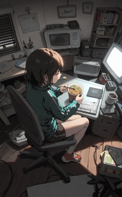 masterpiece,very aware,highres,absurdres,newest,best quality,loli,petite,high quality,chromatic_aberration,cinematic_angle,dutch angle,//,artist:ciloranko,artist:ningen_mame,artist:sho_(sho_lwlw),artist:rhasta,artist:wlop,artist:ke-ta,artist:hiten \(hitenkei\),//,best, computer, 1girl, solo, monitor, keyboard (computer), chair, eating, sitting, crt, trash can, drawing tablet, food, indoors, closed eyes, desk, shorts, mouse (computer), office chair, swivel chair, from above, wooden floor, short hair, track jacket, jacket, cup, sneakers, mug, chopsticks, cable, shoes, poster (object), television, blonde hair, spoon, laptop, cardboard box, box, window, can, stylus, pen, noodles, fork, messy room, dark, holding, bowl, black shorts, lamp, tissue box, table, long sleeves, earphones, coffee, cup ramen, book, electrical outlet, coffee mug, plate, on chair, holding spoon, chewing, full body, scissors, wire, trash, screwdriver, earbuds, track suit, green jacket, game console, phone, holding chopsticks, drawer, red footwear, screen, messy, night, cabinet, calendar (object), holding food, cd, paper, picture frame, bottle, folding chair, desk lamp, speaker, chips (food), holding stylus, drink can, photo (object), soda can, controller, curtains, ramen, print mug, gym shorts, potato chips, fisheye, bulletin board, shelf, brown hair, sticky note, sleeping, cellphone, pencil, tape, rug, disposable cup, bookshelf, remote control, zipper, floor, notebook, paint can, no socks, light, product placement, short shorts, pet bowl, holding fork, book stack, eraser, figure, painting (object), pizza, closed mouth, headphones, drawing (object),<lora:lp47-000020:0.8>,