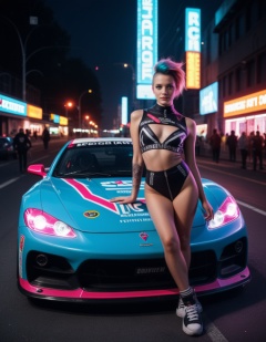 score_9,score_8_up,score_7_up,score_6_up,score_5_up,masterpiece,best quality,realistic,photorealistic,photo \(medium\),absurdres,cinematic,intricate detail,uhd,4k,cyberpunk,race car,streamline design,colorful,vibrant,neon lighting,glowing,1girl,leaning against car,looking at viewer,street,punk style,rebellious,
