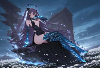 1girl,solo,Cirrocumulus,Cirrostratus,sky,wind,petals,white flowers,magazine cover,backlighting,text,masterpiece,best quality,amazing quality,very awa,newest,very aesthetic,dynamic pose,looking_at_viewer,seductive_smile,dynamic_angle,<lora:涟:1>,lian,hair between eyes,long hair,purple hair,two side up,yellow eyes,shoulders,blue chinese clothes,blue glowing gloves,black glowing headwear,blue glowing thighhighs,blue fire,breasts,center opening,long gloves,halo,leaf hair ornament,no shoes,glow texture,sitting,crossed_legs,<lora:杨贵妃:1>,