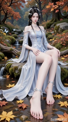 Background: Set against an autumnal backdrop with fallen leaves, butterflies, and a ground carpeted with a rich palette of orange, yellow, and red autumn leaves. Include moss - covered stones, weeds, wildflowers, and a clear - flowing stream with fallen leaves floating on its surface. This creates a rich, serene autumnal atmosphere, highlighting the beauty of nature. A maple branch is positioned in the foreground of the shot.
