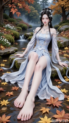 Background: Set against an autumnal backdrop with fallen leaves, butterflies, and a ground carpeted with a rich palette of orange, yellow, and red autumn leaves. Include moss - covered stones, weeds, wildflowers, and a clear - flowing stream with fallen leaves floating on its surface. This creates a rich, serene autumnal atmosphere, highlighting the beauty of nature. A maple branch is positioned in the foreground of the shot.
