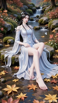 Background: Set against an autumnal backdrop with fallen leaves, butterflies, and a ground carpeted with a rich palette of orange, yellow, and red autumn leaves. Include moss - covered stones, weeds, wildflowers, and a clear - flowing stream with fallen leaves floating on its surface. This creates a rich, serene autumnal atmosphere, highlighting the beauty of nature. A maple branch is positioned in the foreground of the shot.