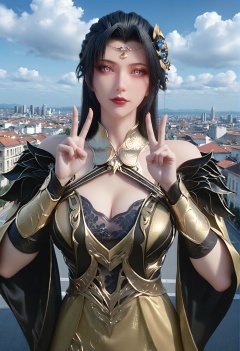 (score_9),<lora:柳如烟-Apony:0.83>,lry,(mature_female),solo,long hair,hair ornament,black hair,mole under eye,detached collar,forehead jewelry,wrist guards,dress,sleeve,<lora:perfect eyes_v1:0.68>,bright pupils,upper body,looking at viewer,front view,double v,light blush,<lora:Expressive_H-000001:0.8>,(glamor:1.2),curvy,collarbone,pointy breasts,puffy breasts,large breasts,narrow waist,outdoors,street,blue sky,blur background,building,city,cloud,cloudy sky,day,depth of field,