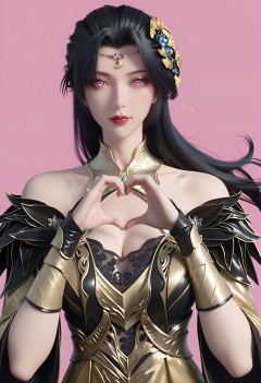(score_9),<lora:柳如烟-Apony:0.75>,lry,(mature_female),solo,long hair,hair ornament,black hair,mole under eye,detached collar,forehead jewelry,wrist guards,dress,sleeve,<lora:perfect eyes_v1:0.68>,bright pupils,upper body,looking at viewer,front view,light blush,heart hands,<lora:Expressive_H-000001:0.8>,(glamor:1.2),curvy,collarbone,pointy breasts,puffy breasts,large breasts,narrow waist,simple background,pink background,