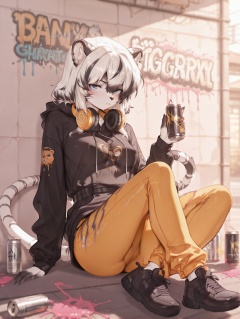 1girl, solo, looking_at_viewer, long_sleeves, holding, sitting, closed_mouth, full_body, shoes, pants, hood, black_footwear, hoodie, headphones, can, black_hoodie, headphones_around_neck, holding_can, paint_splatter, graffiti, yellow_pants, spray_can,furry,<lora:baihu-000080:0.8>,furry,blue eyes,wave hair,streaked_hair,white and black hair,tail,long tail,ear_piercings,ear_rings,nipple_piercings,nipple_rings,black fingernails,animal feet,pink paw,small breasts,baihu,<lora:gtz-000117:0.95>,