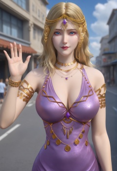 (score_9),<lora:卡丹1-Apony:0.83>,kardan,(mature_female),solo,blonde hair,long hair,hair ornament,jewelry,necklace,forehead jewel,head chain,gem,armlet,bracelet,purple dress,<lora:perfect eyes_v1:1>,blue eyes,looking at viewer,front view,light blush,bright pupils,<lora:Expressive_H-000001:0.8>,(waving:1.1),collarbone,pointy breasts,puffy breasts,large breasts,narrow waist,outdoors,street,blue sky,blur background,building,city,cloud,cloudy sky,day,depth of field,<lora:皮肤凹痕:1.2>,