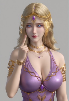 (score_9),<lora:卡丹1-Apony:0.83>,kardan,(mature_female),solo,blonde hair,long hair,hair ornament,jewelry,necklace,forehead jewel,head chain,gem,armlet,bracelet,purple dress,<lora:perfect eyes_v1:1>,blue eyes,looking at viewer,front view,light blush,bright pupils,<lora:Expressive_H-000001:0.8>,(middle_finger),hand_gesture,(pointing_at_viewer),upper body,collarbone,pointy breasts,puffy breasts,large breasts,simple background,grey background,<lora:皮肤凹痕:1.2>,