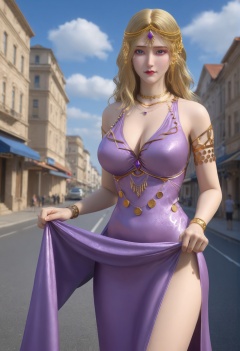 (score_9),<lora:卡丹1-Apony:0.85>,kardan,(mature_female),solo,blonde hair,long hair,hair ornament,jewelry,necklace,forehead jewel,head chain,gem,armlet,bracelet,purple dress,<lora:perfect eyes_v1:1>,blue eyes,looking at viewer,front view,light blush,bright pupils,<lora:Expressive_H-000001:0.8>,(dress_lift:1.1),clothes_lift,(lifted_by_self:1.1),skirt_flip,collarbone,pointy breasts,puffy breasts,large breasts,narrow waist,thighs,side slit dress,outdoors,street,blue sky,blur background,building,city,cloud,cloudy sky,day,depth of field,<lora:皮肤凹痕:1.2>,