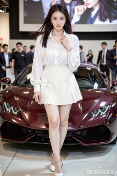 8K, ultra clear, Beautiful car model, fair skin, tender legs, slender legs, full body photo, wearing white high heels. In the 8x resolution ultra-clear picture, the car show scene is bright and lively. Next to it is a luxury Lamborghini. There is a large screen above the back. She is wearing a white shirt, a white pleated skirt, 36D breasts, and her long hair Dancing in the wind shows her flexibility and freedom. With a confident and cheerful smile on her face, she has an elegant figure, her plump breasts outline charming curves, and her clear vest lines highlight her health and vitality. In such a car show atmosphere, she exudes a sexy and charming unique charm. Background characters are real,yoga pants,photo taken with a Canon EOS R6 Mark II Mirrorless camera in the style of 35mm f/8 aperture,