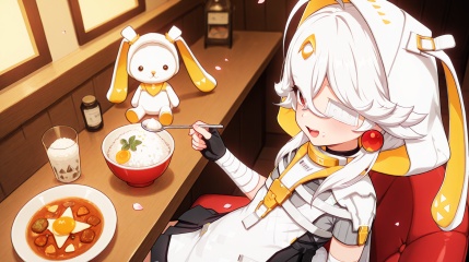 huge filesize,colorful,Volumetric Lighting,available light,moody lighting,rim light,masterpiece,best_quality,amazing_quality,highly_detailed,very_aesthetic,1girl,solo,long hair,ahoge,bangs,red eyes,hair over one eye,short hair,white hair,wintails,hair ornament,hood,rabbit hood,eyepatch,animal hood,hood up,animal ears,rabbit ears,rabbit tail Behind the clothes,earrings,jewelry,skirt,dress,short dress,white dress,black skirt,gloves,short sleeves,bandages,bandaged arm,fingerless gloves,stuffed toy,looking_at_viewer,bandaid,bandaged arm,<lora:蕾贝13:1>,falling petals,little_girl,pentagram,sitting_on_chair,isbn,(upper_body:1.5),(bust:1.4),portrait,dusk,:d,front view,from_above,restaurant,rice on face,eat rice,holding spoon,