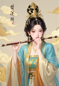 Dunhuang painting style,chinese traditional painting,This is a Dunhuang grotto murals painting in a traditional Chinese style, depicting a serene, ethereal woman with long, flowing black hair adorned with a golden crown. She wears a flowing, ornate brown and gold outfit, playing a flute. Her expression is calm, and she floats against a textured, muted brown and beige background with wispy, cloud-like patterns.<lora:Nephrite Nymph(IL):0.3>Nephrite Nymph c <lora:20250612-1749733143985:1c0.3>