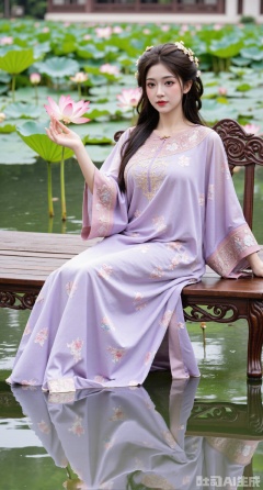 (masterpiece:1.2), best quality, A stunning young woman sits elegantly on a intricately carved wooden bench amidst a serene pond, surrounded by vibrant lily pads and lush greenery. She wears a exquisite purple and white dress with delicate pink and gold embroidery on the chest and short sleeves, paired with gold high heels. Her long, dark hair cascades in loose waves, framing her gentle face. One hand rests on her hip, while the other holds a majestic lotus, exuding tranquility. The background is a kaleidoscope of pink and white lotus flowers, set against a subtle traditional Chinese architectural backdrop, (huge breasts:2.99),(full breasts:2.99),(Background with traditional Chinese architecture, lotus pond and pink lotus flowers:1.59)Xhanfududou,Xsongzhihanfu,Xlujiajia,Xyanqingfei,XfuqingyunY,Xtangqixiongshanqun,Xfeitianhanfu,Xqinghannu,XmeijiX2,XmeijiX