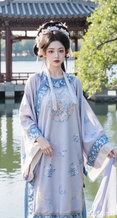 (masterpiece,best quality:1.23), girl in front-skirt hanfu with blue-and-white porcelain pattern, tassels, mandarin square, cloud shoulder, pavilion over stream background, gentle sunlight,(huge breasts, full breasts:2.98),Xhanfududou,Xsongzhihanfu,Xlujiajia,Xyanqingfei,XfuqingyunY,Xtangqixiongshanqun,Xfeitianhanfu,Xqinghannu,XmeijiX2,XmeijiX