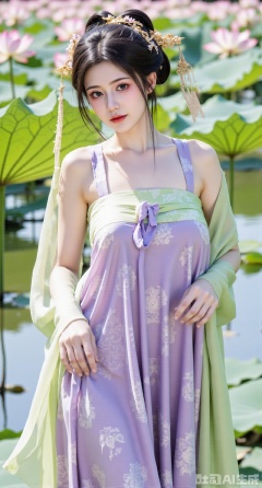 (masterpiece, best quality:1.2),1girl, navel, solo, midriff, shoulders, hair ornament, flower, hair flower, black hair, red lips,BREAK, (looking at viewer:1.39), Song-style Hanfu clothes,(Holographic pink pleated skirt:1.39), (Holographic purple beizi:1.39),(Holographic green Song Dynasty style tube top:1.29),purple eyes,blurry, solo focus, very long hair, lips, daytime, lipstick, outdoors, (upper body,Long legs:1.29),(Extra large cup,K cup:1.49),, background, 1girl, makeup, hair bun,(Blue sky:1.39),( Garden Lotus Pond,pink lotus,green Lotus Leaf:1.39), (huge breasts, full breasts:2.99),liumeiY,XyueliuY,Xyunwangshu,XlishaoyinY,XyunwangshuxiheY,XlinziyueYH,XtangzichenK,Xnuwashenian,Xbigbreasts,XyanqingfeiY,XyinyueXH,XyunxiaoYK,Xsonghanfu,XlingyuyxiuX,XlingyuyxiuX2,Xqinghannu,Xtangqixiongshanqun