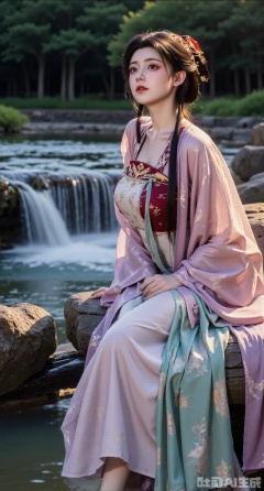 (masterpiece,best quality:1.23), A pensive girl in a classic Tang dynasty Qixiong Ruqun, deep rich colors, adorned with jade accessories, sitting elegantly on a rock beside a cascading waterfall, magical forest setting, dramatic lighting.