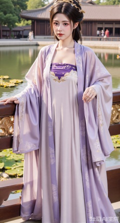 (masterpiece,best quality:1.23), A detailed front view of a girl in a luxurious Tang dynasty Hanfu Qixiong Ruqun, showcasing the layered fabrics, transparent outer blouse, and elaborate gold patterns, standing on an ornate bridge over a koi pond, opulent palace setting.