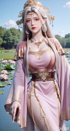 (masterpiece, best quality:1.2),1girl, navel, solo, midriff, bare shoulders, hair ornament, flower, hair flower, long white hair, red lips,BREAK, (looking at viewer:1.39), chinese clothes,(Holographic dress:1.39), (lace,Rainbow Gradient Color:1.29),BREAK,purple eyes,blurry, solo focus, long hair, lips, daytime, lipstick, outdoors, (upper body,,Long legs:1.29), blurry,(huge breasts,full breasts:1.41), background, 1girl, makeup, hair bun,Xyunxiao,(Blue sky:1.39),(Suzhou Garden Lotus Pond,pink lotus,green Lotus Leaf:1.39),(huge breasts:2.99), (full breasts:2.99),,,XyunxiaoYK,Xsonghanfu,XlingyuyxiuX,XlingyuyxiuX2,Xqinghannu,Xtangqixiongshanqun