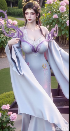 masterpiece:1.2),best quality,,A woman adorned in traditional Chinese attire,featuring a flowing robe with intricate embroidery and floral accents. A garden filled with pink roses and lush greenery. Soft pastel hues of white,blue,and green,creating a serene atmosphere. Photorealistic photography.,,(huge breasts:2.99),(full breasts:2.99),XyunxiaoYK,Xsonghanfu,XlingyuyxiuX,XlingyuyxiuX2,Xqinghannu,Xtangqixiongshanqun,XmeijiX2,XmeijiX
