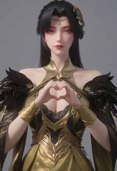 (score_9),<lora:柳如烟-rain:0.8>,lry,(mature_female),solo,long hair,hair ornament,black hair,mole under eye,detached collar,forehead jewelry,wrist guards,dress,sleeve,<lora:perfect eyes_v1:1>,bright pupils,looking at viewer,front view,<lora:Expressive_H-000001:0.8>,heart hands,(glamor:1.2),curvy,collarbone,pointy breasts,puffy breasts,large breasts,narrow waist,simple background,grey background,