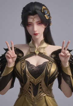 (score_9),<lora:柳如烟-rain:0.8>,lry,(mature_female),solo,long hair,hair ornament,black hair,mole under eye,detached collar,forehead jewelry,wrist guards,dress,sleeve,<lora:perfect eyes_v1:1>,bright pupils,looking at viewer,front view,looking at viewer,front view,double v,light blush,<lora:Expressive_H-000001:0.8>,(glamor:1.2),curvy,collarbone,pointy breasts,puffy breasts,large breasts,narrow waist,simple background,grey background,