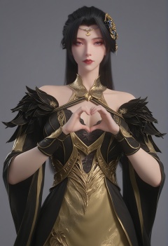 (score_9),<lora:柳如烟-rain:0.8>,lry,(mature_female),solo,long hair,hair ornament,black hair,mole under eye,detached collar,forehead jewelry,wrist guards,dress,sleeve,<lora:perfect eyes_v1:1>,bright pupils,looking at viewer,front view,<lora:Expressive_H-000001:0.8>,heart hands,(glamor:1.2),curvy,collarbone,pointy breasts,puffy breasts,large breasts,narrow waist,simple background,grey background,