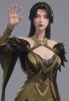 (score_9),<lora:柳如烟-rain:0.8>,lry,(mature_female),solo,long hair,hair ornament,black hair,mole under eye,detached collar,forehead jewelry,wrist guards,dress,sleeve,<lora:perfect eyes_v1:1>,bright pupils,looking at viewer,front view,<lora:Expressive_H-000001:0.8>,reaching_out,(waving:1.1),(glamor:1.2),curvy,collarbone,pointy breasts,puffy breasts,large breasts,narrow waist,simple background,grey background,