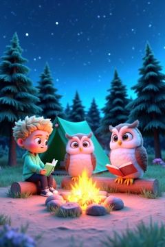 beijihui,Captured at eye-level on a vibrant day, three cartoon characters are sitting on logs in front of a campfire. The owl on the right is reading a book, while the owl in the middle is looking at the camera. On the left, a boy with blonde hair and a green shirt is sitting on a log. In the background, a green tent is set against a backdrop of pine trees. The sky is a deep blue, with white stars dotting the scene.