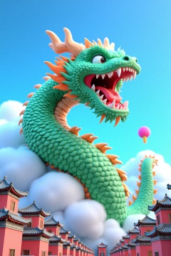 beijihui,a vibrant green dragon is soaring through the air,its mouth wide open. Its head is adorned with a pink ball,adding a pop of color to the scene. In the background,a row of pagoda buildings can be seen. The sky is a deep blue,dotted with fluffy white clouds.,