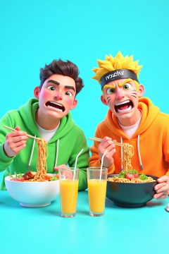beijihui,Captured on a vibrant blue backdrop, two cartoon characters are seated at a table. The character on the left is wearing a green hoodie, while the one on the right is wearing an orange hoodie and a black headband with the word "vady" written on it. Both characters are holding chopsticks in their hands. They are eating a bowl of noodles, which is filled with a variety of food. Two glasses of orange juice are on the table in front of them.