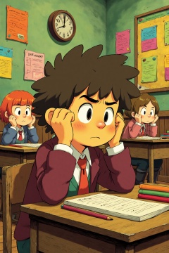 beijihui,A cartoon drawing of a boy with brown hair and a red tie is sitting at a brown wooden desk in a classroom. He is wearing a maroon long sleeve shirt with a green and white stripe down the center of his chest. His ears are held up to his ears and he has a serious expression on his face. Behind him are two girls sitting at brown wooden desks. One of the girls has red hair and the other girl has brown hair. There is a green wall behind them with a brown clock on it. There are colorful papers hanging on the wall.