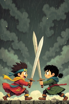 beijihui,Captured at eye-level, a cartoon depiction of two cartoon characters engaged in a battle. The character on the left is dressed in a red coat with a yellow scarf around his neck, and a blue headband on his head. He is holding a sword in his right hand, and he is facing to the right. His right hand is positioned in front of him, while his left hand is in the air. His mouth is open, as if he is screaming. His eyes are white, and his mouth is slightly open. His hair is black, and it is tied in a ponytail. The background is a dark gray, and there are white rain drops falling from the sky.