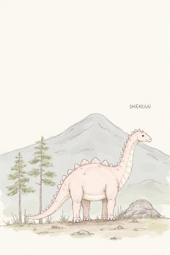 beijihui,A medium-sized sketch of a white brontosaurus is standing in front of a mountain range,its head facing the right side of the frame. The front of the dinosaur is facing the left,and its head is turned slightly to the right. There are two trees to the left of the image,one with green leaves and the other with light green leaves. There is a small hill behind the dinosaur,and there is a text in the upper right corner that reads "SHEKEN".,