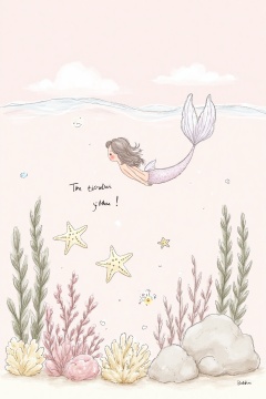 beijihui,A medium-sized sketch of a mermaid in the ocean is drawn on a light pink background. The mermaid's tail is drawn in the shape of a tail, with her hair cascading down to her back. Her tail is long and curved, and she is floating in the air. Below the mermaid, there is a text written in black ink that reads "Mano" in a smaller font. Below that, there are three starfish, and two smaller starfish. To the left of the starfish is a coral reef, and to the right of the coral reef is a large rock. The background is light pink, with a few wispy clouds in the distance.