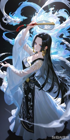 fuzhuang,fuzhuang,chinese clothes,dress,1girl,hanfu,long sleeves,standing,see-through,wide sleeves,jewelry,black dress,white dress,depth of field,holding,hand fan,facing viewer,